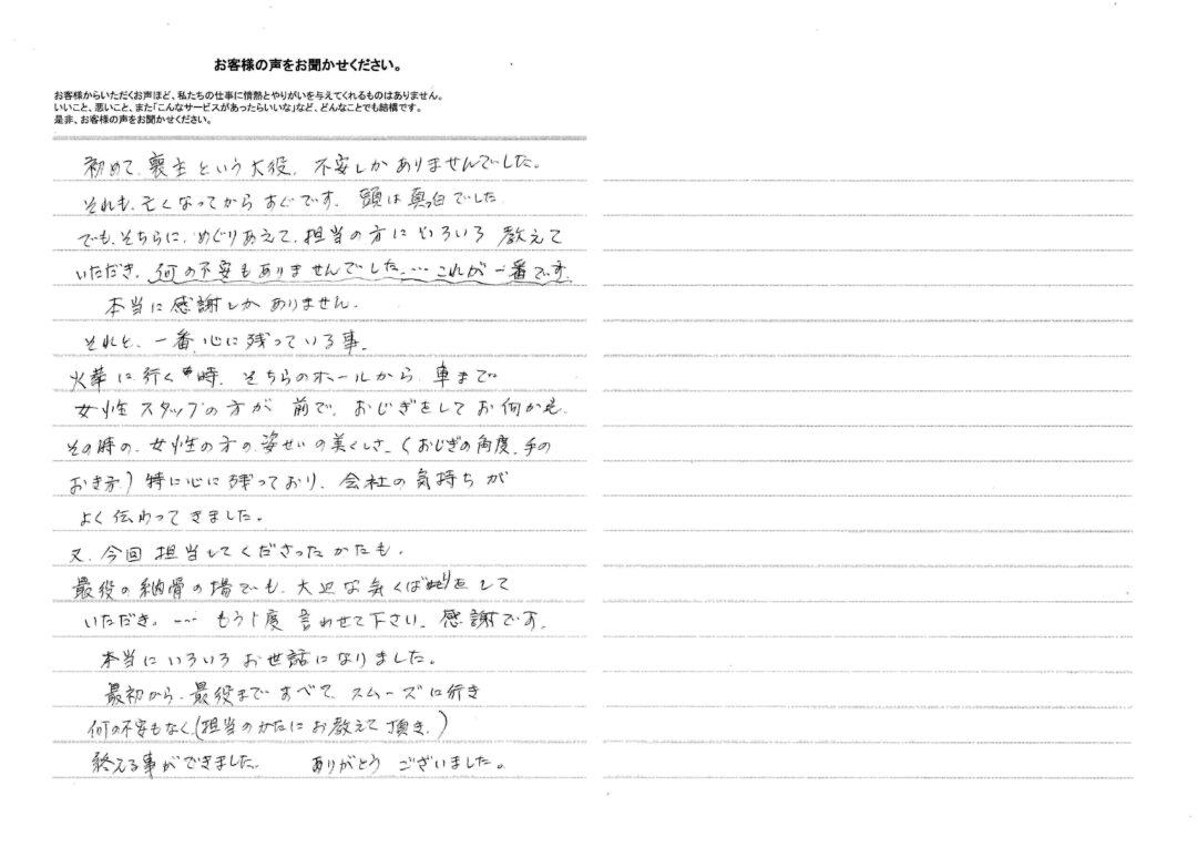 お客様の声 お客様からいただいた、感謝のお言葉をご紹介させていただきます。 初めて喪主という大役、不安し … 選んだプランには付いてなかっ … ・夜間帯も全てのサービス内容 … 病院から自宅までの運転手さん … 担当の〇〇さんをはじめ、スタ … この度は、大変お世話になり、 …